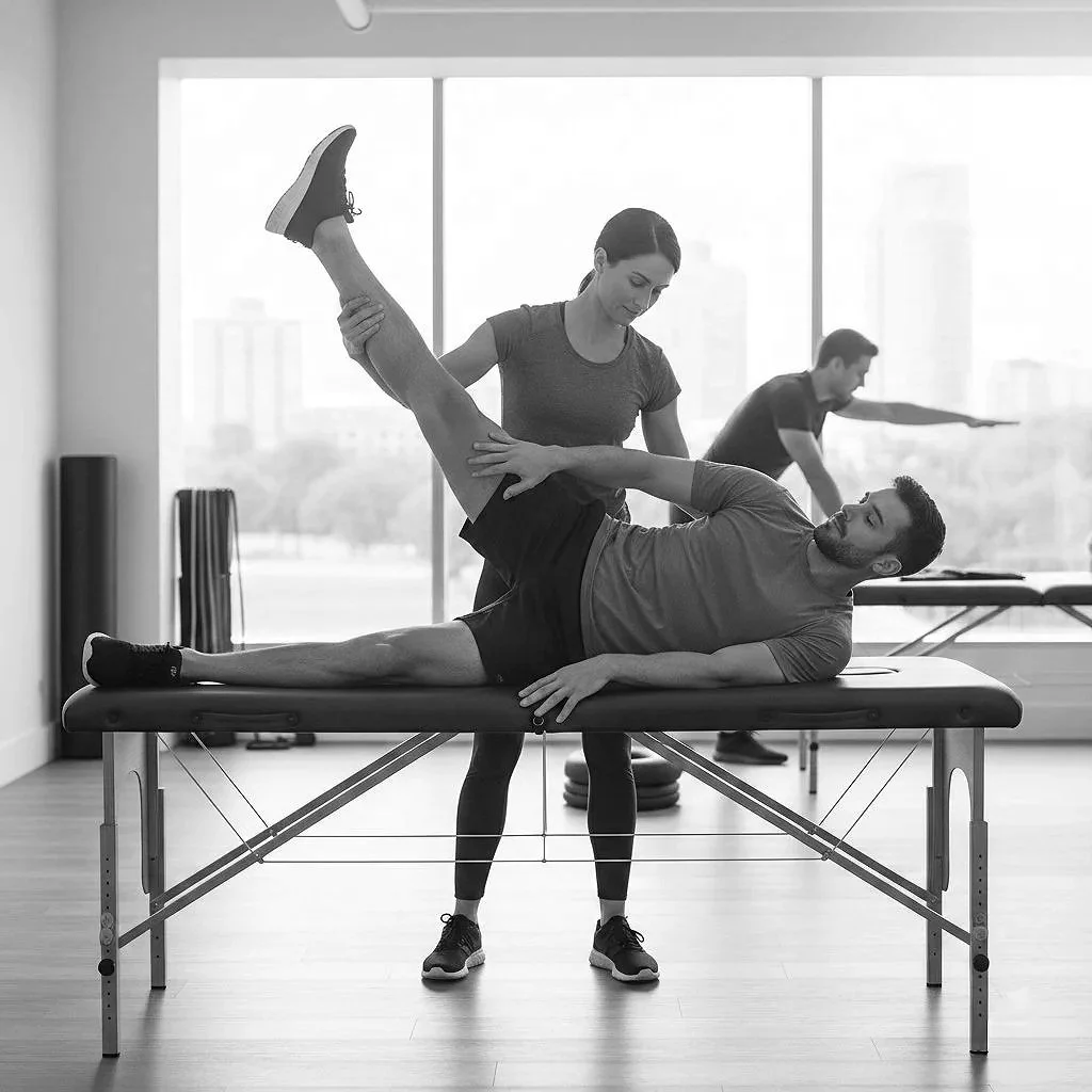 Assisted stretching is used to increase joint range of motion and improve muscle flexibility under controlled conditions. The therapist guides your body through specific stretches to safely lengthen tight tissues and reinforce better movement patterns.